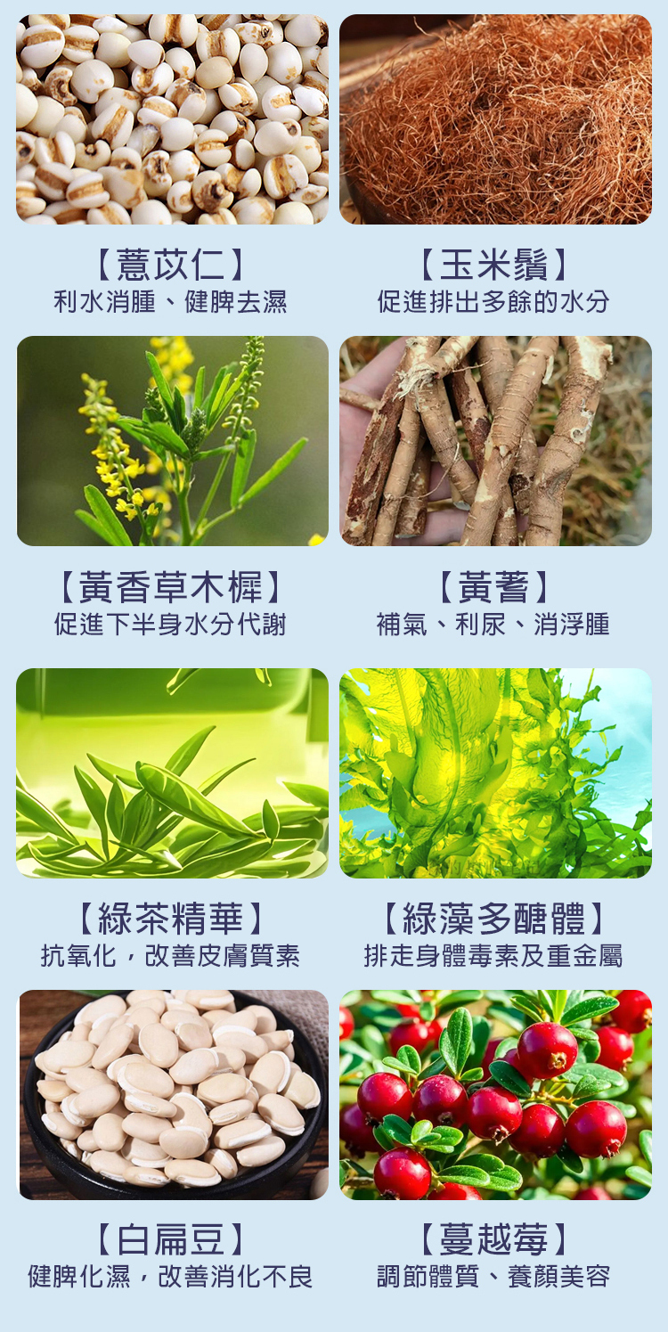 Ingredients : Coix seed extract, Corn silkextract, Melilot extract, Astragalus extract, Gree Tea extract, Chlorella,White Hyacinth Bean, Cranberry, magnesium stearate (anti-caking agent), gelatincapsule